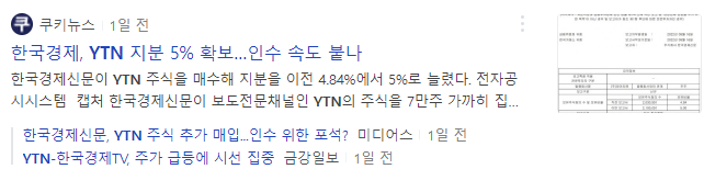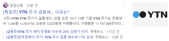 한국경제신문이 YTN의 지분을 5% 확보했다는 소식으로 YTN의 민영화 기대감이 유입되었고 그 결과 YTN은 오늘 상한가를 기록했습니다.