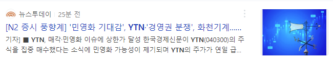 한국경제신문이 YTN의 지분을 5% 확보했다는 소식으로 YTN의 민영화 기대감이 유입되었고 그 결과 YTN은 오늘 상한가를 기록했습니다.