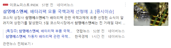 삼영에스앤씨는 2일전 소재부품 기술개발사업 국책과제에 선정된데 이어 오늘 배터리팩 모듈 국책과제에 선정되었다는 소식으로 상한가를 기록했습니다.