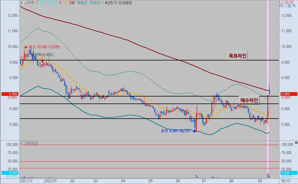 충분한 조정을 진행한 이후 바닥구간에서 상한가가 출현한 소마젠의 주가는 앞으로 어떻게 움직일 지 알아보도록 하겠습니다.