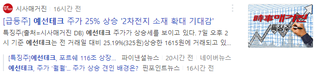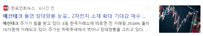 2차전지 소재분야 사업에 진출할 가능성이 있다는 기대감으로 예선테크는 이날 상한가를 기록했습니다.