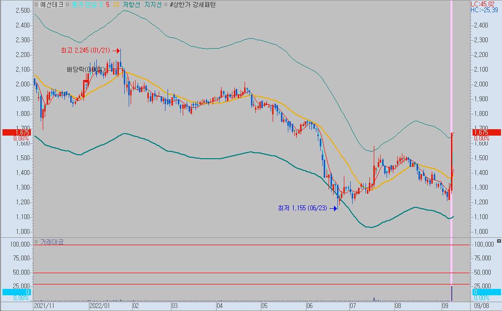 예선테크는 어제 2차전지 소재 산업으로 사업을 확장할 가능성이 있다는 기대감으로 상한가를 기록했습니다. 2차전지 관련주로 분류되며 상장 이후 첫 상한가를 기록한 예선테크의 주가는 앞으