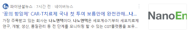 국내 첫 킴리아(CAR-T 치료제) 투여 환자 완전관해 사례 확인 등 CAR-T 치료가 본격화되고 있는 가운데 각 단계별 세포를 확인 및 측정할 수 있는 종합 CGT 플랫폼 제공하니 나노엔텍에 수급이 집중되며 금일 상한가를 기록했습니다.