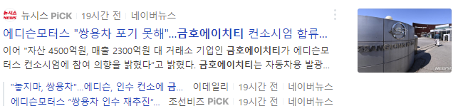 에디슨모터스가 쌍용차 인수를 위해 컨소시엄 투자자를 모집중인데 금호에이치티에 쌍용차 인수 컨소시엄 참여를 제안했다는 소식으로 이날 상한가를 기록하였습니다.
