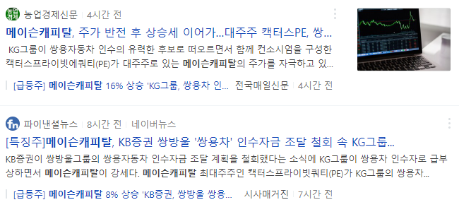 KB증권이 쌍방울 그룹 '쌍용차' 인수를 위한 자금을 조달하기로 하였으나 금일 자금지원을 철회하면서 KG그룹의 쌍용차 인수기대감이 상승하면서 메이슨캐피탈이 상승하였습니다. 메이슨캐피탈은 KG그룹과 컨소시엄을 맺은 캑터스프라이빗쿼티의 자회사입니다.