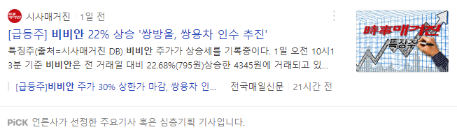 쌍방울그룹이 쌍용차를 인수할 가능성이 있다는 기대감이 지속되는 가운데 비비안이 쌍방울 그룹의 계열사인 점이 부각되며 상한가를 기록했습니다. (+30.00%)