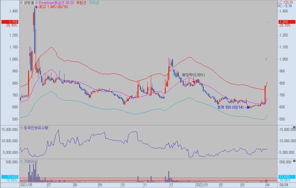 쌍방울그룹이 쌍용차를 인수할 가능성이 높다는 전망이 유입되면서 점상한가를 기록하였습니다. (+29.70%)