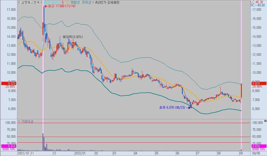 삼영에스앤씨는 소재부품 기술개발 사업 국책과제에 선정된 것과 배터리팩 모듈 국책과제에 선정되었다는 소식으로 상한가를 기록하였습니다.