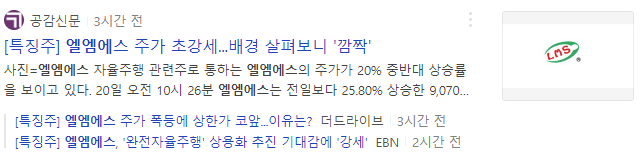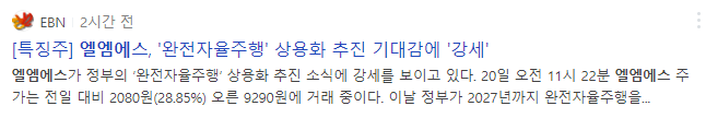 자율주행의 대표적인 대장주인 모트렉스가 시간외 상한가를 기록했는데 정규장에서는 엘엠에스가 완전자율주행 상용화 이슈로 상한가를 기록했습니다.