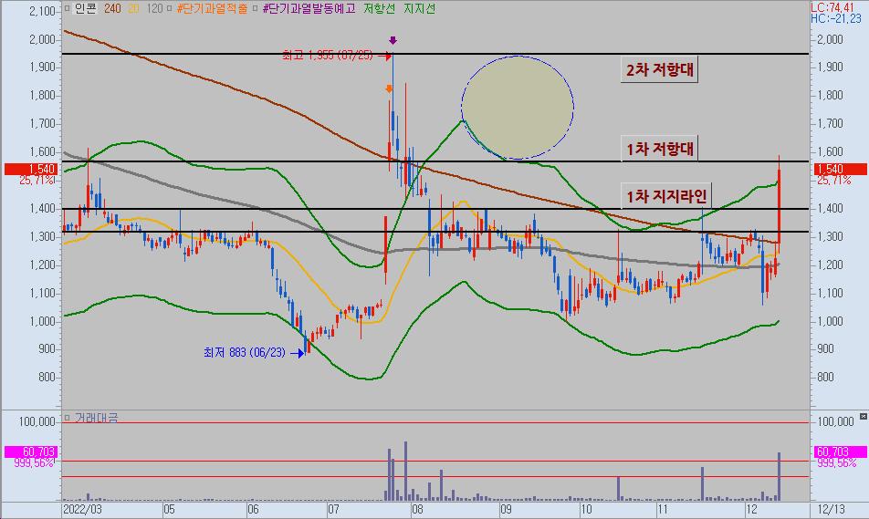 인콘 종목에 신규 진입을 원하시는 분은 단기관점에서 위의 차트상 1차 지지라인 부근까지 조정을 받으면 손절가를 설정하고 매수진입하는 것도 괜찮아 보이니 투자에 참고하시길 바랍니다.