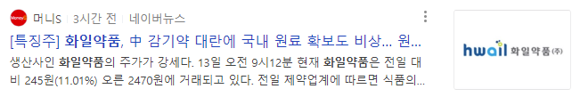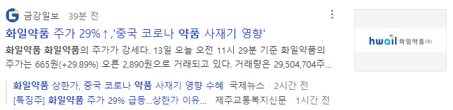 중국이 코로나 약품을 사재기하고 있다는 소식으로 오늘 화일약품은 급등세를 보였습니다.