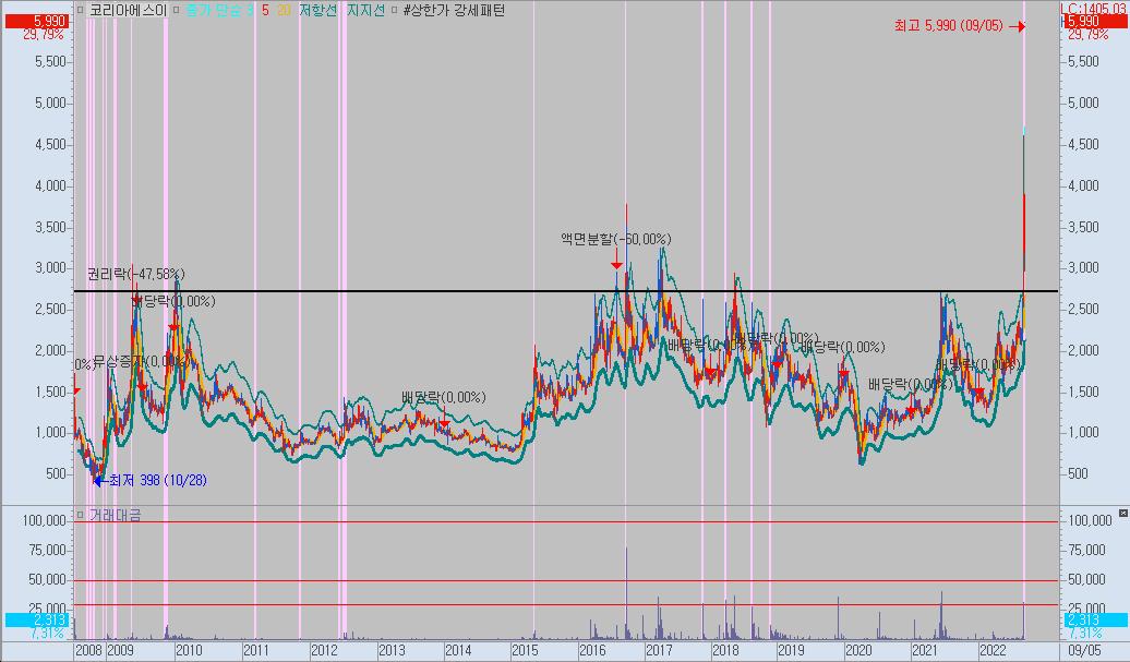 위의 차트에서 보는 것과 같이 코리아에스이가 2008년 상장된 이후 가장 높은 주가를 형성중에 있습니다.