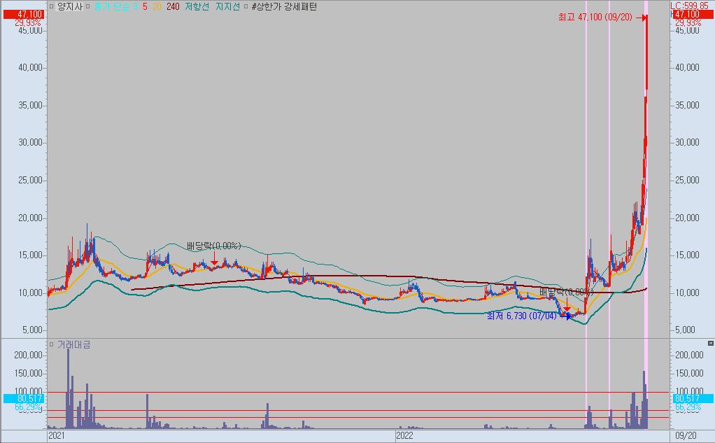 양지사는 지난 7월 4일 6730원을 저점으로 형성한 이후 변격적인 상승이 나와 현재는 47100원까지 상승하였습니다.