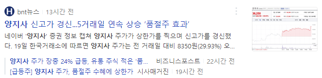 양지사는 품절주 효과라는 명목으로 급등하면서 현재는 양지사가 상장한 이후 역대 최고가를 기록중에 있습니다.