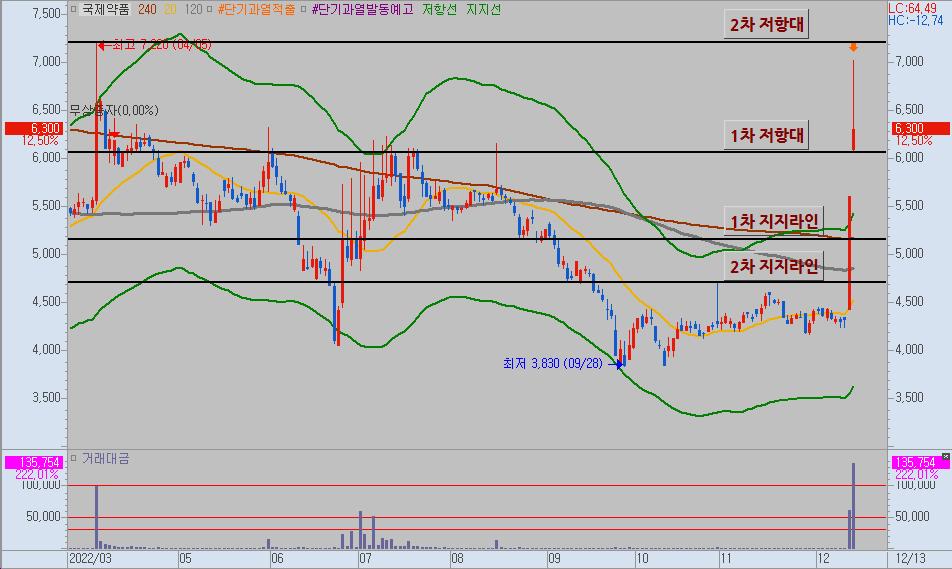 만약 국제약품의 주가가 조정을 받는다면 위의 차트상 표시해둔 1차 지지라인과 2차 지지라인 부근까지 조정이 나올 수 있으니 투자에 유의하는 것이 좋겠습니다.