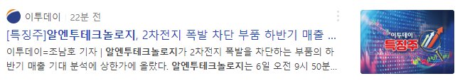 그런 이후 2차전지의 폭발을 방지하는 부품 개발에 따라 하반기 부터 매출신장이 기대된다는 이슈로 금일 상한가를 기록중에 있습니다.