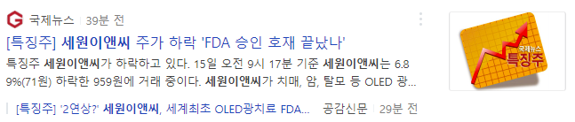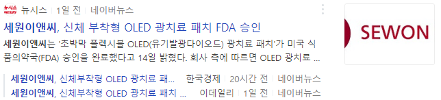 세원이앤씨는 '초박막 플렉시블 OLED 광치료 패치' 가 미국 식품의약국 승인을 완료했다고 9월 14일 밝히면서 주가는 상한가를 기록했습니다.