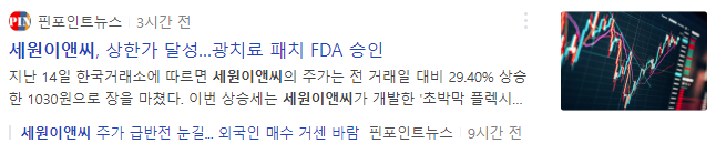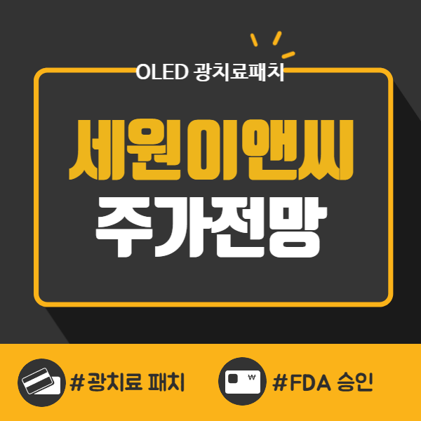 오늘은 세원이앤씨가 개발한 광치료 패치가 미국 FDA 승인을 완료했다는 소식으로 급등중인 세원이앤씨의 주가는 앞으로 어떻게 움직일 지 알아보도록 하겠습니다.