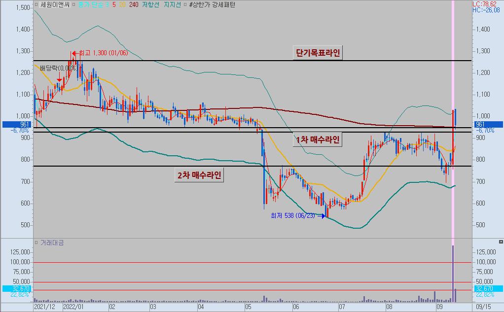 세원이앤씨 종목을 저점에서 매수하여 현재 수익중인 분은 최소 익절가를 설정하고 수익을 극대화하는 전략으로 접근해도 괜찮아 보입니다.